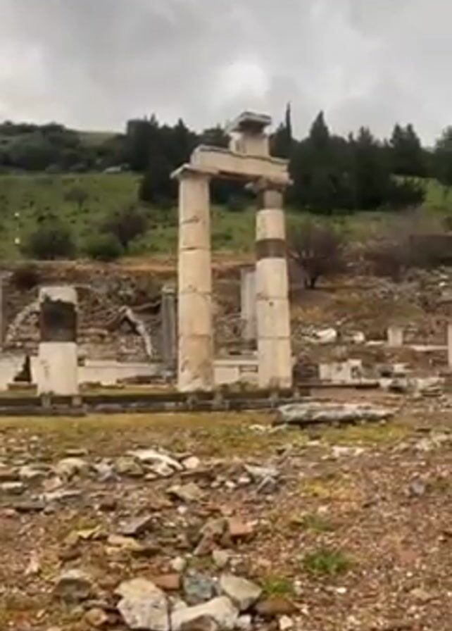 remains of an ancient structure, likely a temple or public building, set against a natural landscape on an overcast day. The primary feature is a partial stone archway supported by two columns that are white with brown rings on the right column. The area around the structure is strewn with rocks and fragments of other stones and remnants of the structure. Behind the site, a hillside covered with green grass and sparse trees is visible. The sky is gray and overcast, suggesting a cloudy or possibly rainy day. There are some people in the background.