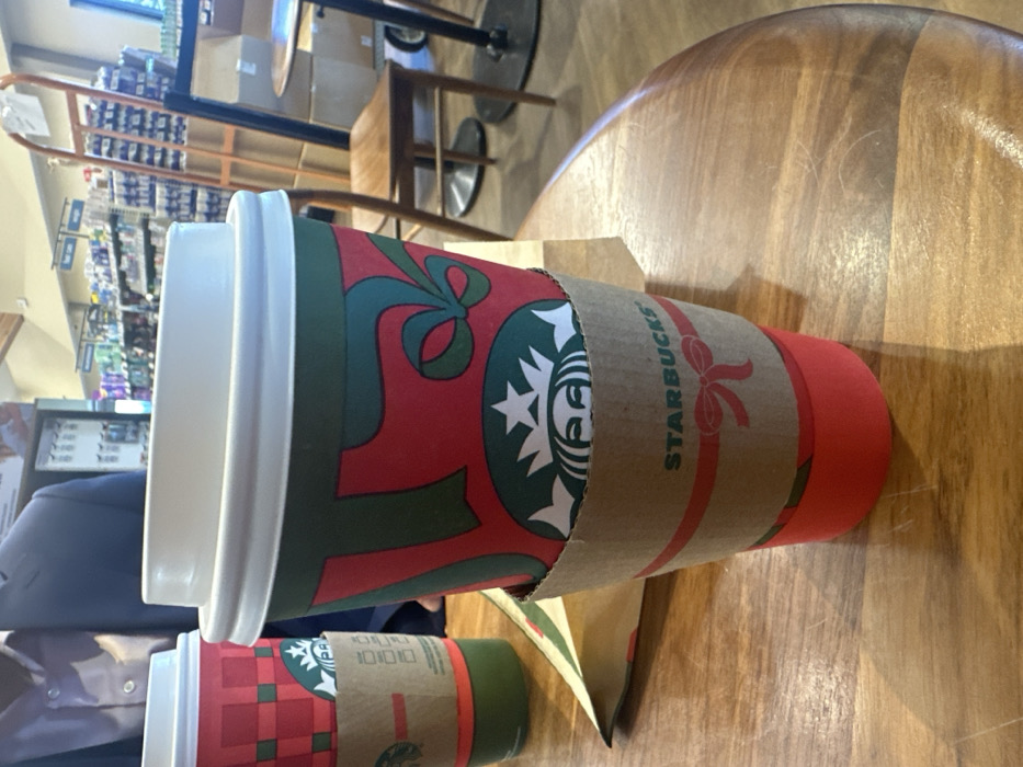 - "The image displays two Starbucks disposable coffee cups on a polished light-colored wooden table, situated within an indoor retail environment in McCall, Idaho, United States" by FM-REIZd2, licensed under CC BY 4.0