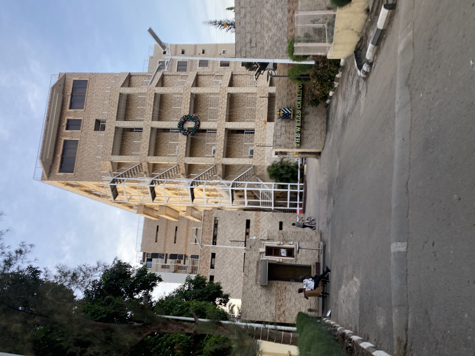 The image displays the entrance to The Wells Carlton Hotel and Apartments, located in Asokoro, Abuja, Nigeria. The central subject is a multi-story building with a facade of tan-colored stone cladding, featuring several balconies with white railings. An external white metal staircase ascends the left side of the main building's visible face. A large green Christmas wreath is affixed to a balcony railing on the third level. In the left foreground, a smaller, single-story building with a brown door stands adjacent to the driveway. Two adult males are seated on chairs outside this building; one wears a white shirt and dark trousers, while the other wears a dark shirt and dark trousers. A paved asphalt driveway leads into the property, delineated by black and white striped curbs. An automatic boom barrier is partially open, positioned just beyond a prominent concrete sign structure on the right side of the driveway. This sign, also clad in stone, displays "THE WELLS CARLTON" in green lettering, accompanied by a crest. A male on a bicycle is positioned beyond the boom barrier, facing away from the camera, on the property side of the entrance. Tall green trees line the left edge of the frame, and a modern solar-powered street lamp stands to the right of the main building. The sky above is partly cloudy, indicating daylight conditions.