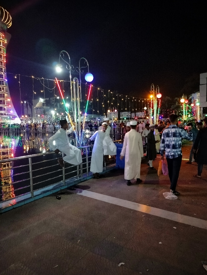 The image depicts a scene at night, likely a festival or celebration, in Charfasson Sadar, Bangladesh. It is a wide shot, captured from a slightly elevated vantage point, showcasing a gathering of people against a backdrop of decorative lighting. A tall tower with an illuminated structure is visible in the background. Several decorative lights are strung across the area. A water feature, likely a pond or fountain, reflects the light, adding to the ambiance. A group of people are standing near a metal railing, the majority of them wearing traditional white clothing, suggesting a religious or cultural event. Several of the men wear white caps, likely religious headwear. One man wearing a dark-colored shirt and blue and white plaid patterned shirt is standing near the edge of the frame, looking at the scene. Two individuals are sitting on the railing, their feet dangling over the water. One person leans against the railing, their back facing the camera. The individuals appear to be interacting and engaged in conversation. The ground is paved with gray concrete. Several plastic bags are scattered on the ground. The image is well-lit, with the light emanating from the decorative lights.