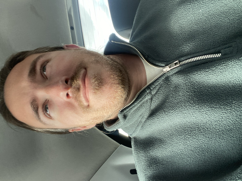 The scene is located within a vehicle in the city of Kolašin, Montenegro. An adult male is depicted from the chest up, seated inside what appears to be a car. He has light skin, brown hair pulled back, and a light brown beard and mustache. The subject is looking upwards and slightly to his right, displaying a neutral to slightly smiling expression. He wears a grey-green fleece pullover with a partially unzipped silver zipper, revealing a light-colored undershirt. The vehicle's interior features a grey headliner and side trim, with a dark seat or headrest visible behind the subject's right shoulder. A rear window is partially visible on the right, indicating ambient daylight.
