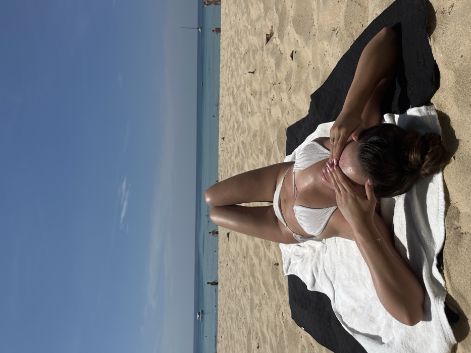 A woman in a white bikini lies on a black and white towel on a sandy beach. She has her hands covering part of her face. The beach is visible in the background, along with the ocean and blue sky. There are several other people visible in the ocean and along the shoreline.