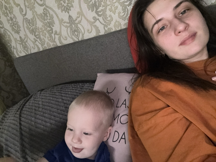 A selfie shows a young woman and a baby, both with fair skin. The woman, with dark hair, wears an orange top. The baby, with blond hair, wears a blue top and sticks out his tongue. They are sitting on a gray textured bed or sofa against a gray headboard and ornate wallpaper. A pink pillow with black eyelash designs and text is visible behind the baby.