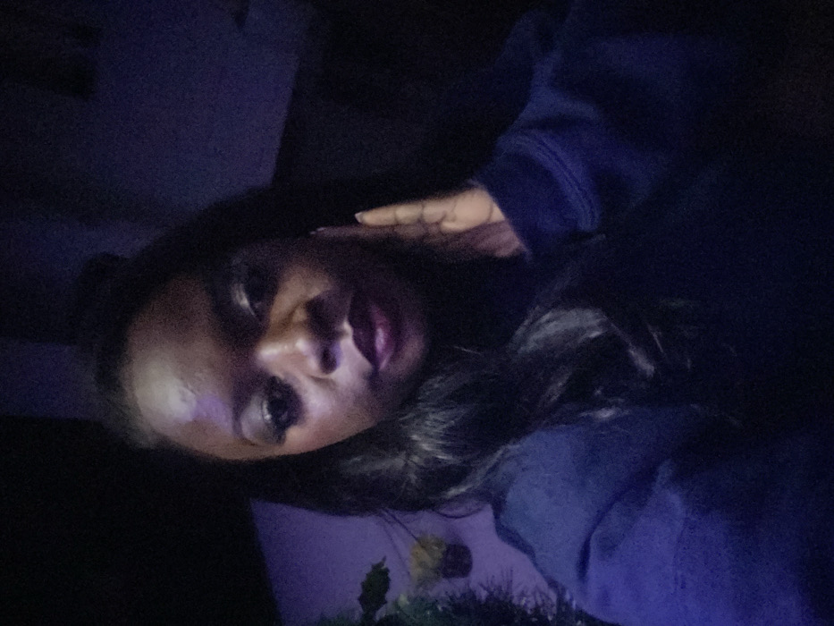 A woman poses in low light. She's slightly angled towards the camera, her dark hair flowing around her face. Her skin appears smooth, with prominent cheekbones and lips. She wears a dark-colored top, possibly a hoodie. Her hand is raised near her ear. The background is dark, though a slight purple hue is visible, along with hints of green.