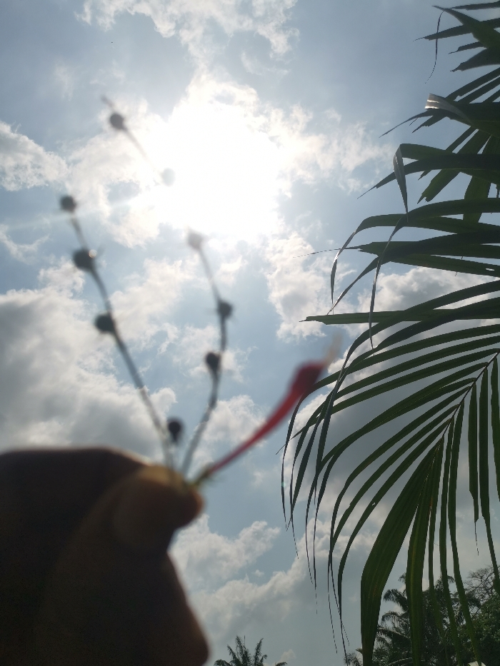 The image captures an outdoor, backlit scene in Otolokpo, Nigeria, under a bright, partly cloudy sky. In the foreground, a human hand is visible, holding a thin plant stem with multiple dark, spherical seed pods or buds, and a distinct red, elongated, pointed object. These elements are heavily blurred and appear as silhouettes. To the right, a large green palm frond extends from the upper right corner, with its individual leaflets clearly defined, partially silhouetted against the sky. The bright sun is prominent in the upper left, surrounded by scattered white cumulus clouds in a blue sky. Faintly visible in the lower right background, behind the palm frond, are dark, silhouetted distant treetops.