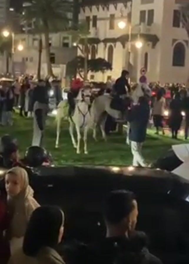 At night, a diverse crowd celebrates in a public space filled with cars, buildings, and grass. Several riders on white horses are in the center, surrounded by people and a few with Moroccan flags. The architecture is modern with an older, castle-like building in the background. A large billboard stands nearby, illuminated. People are dressed in casual winter clothing, and their faces are difficult to discern. The atmosphere is lively and festive.