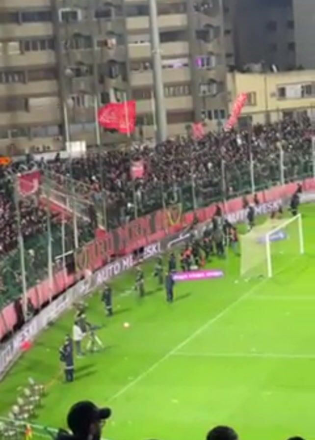 soccer game at night. A large crowd of fans is packed into the stands, waving red and white flags and banners. The field is brightly lit, and a group of people in dark clothing stand near one of the goals. Tall buildings surround the stadium. People in the foreground are watching the game.