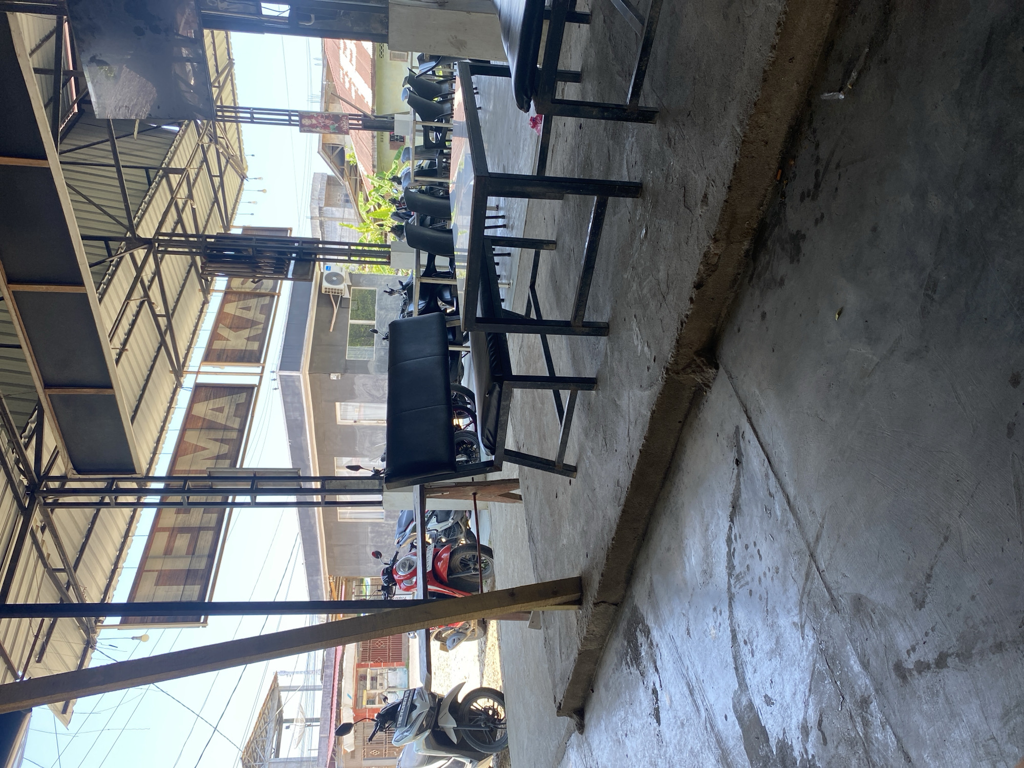 The image depicts an unoccupied, semi-open-air cafe or dining area in Seuneubok Teungoh, Indonesia, under a clear daytime sky