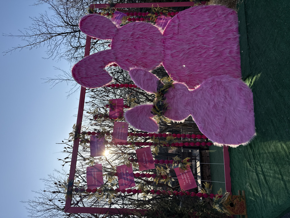 The image displays an outdoor decorative installation located in Shakhty, Russia. The scene features two large, bright pink, shaggy artificial fur rabbit figures positioned on green artificial turf. Both rabbits are depicted from behind, silhouetted against bright sunlight; the smaller rabbit wears a yellow-green floral wreath on its head. Behind these figures stands a large, rectangular wooden frame, painted pink. Suspended from this frame are multiple pink rectangular signs, some decorated with small floral motifs, displaying various congratulatory messages in Russian. Visible texts include phrases such as "Happy March 8th, my swallow!", "Dear dove, happy spring holiday!", "You are magical, like a flamingo!", and "You are the bright hummingbird of this day". Green garlands and vertical strings of red beads are also attached to the frame. In the lower left quadrant, a small, ornate wooden birdhouse rests on the artificial turf, near a set of chains indicative of a swing structure. The background consists of a clear, light blue sky and numerous bare tree branches, suggesting a late winter or early spring environment. Bright sunlight generates a lens flare in the upper central portion of the image.