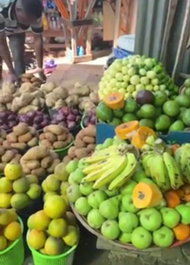 vibrant display of fruits and vegetables at an outdoor market, likely in a tropical location. In the foreground, there are baskets and trays filled with green and yellow fruits, including bananas, guavas, papayas, avocados, and other round fruits. Behind them, there are piles of potatoes and red onions. A man is standing near the potatoes, appearing to be arranging or selecting them. The market is partially covered by a corrugated metal roof, and in the background, there are various household items and decorations.