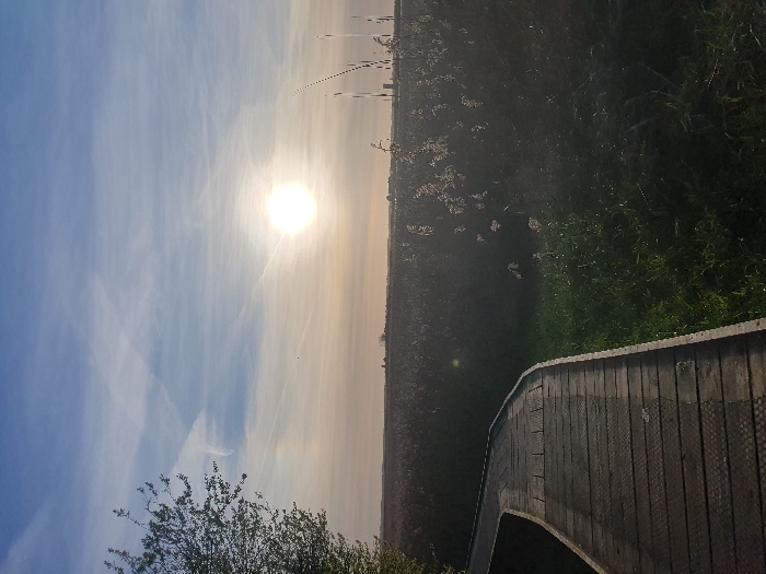 This image captures an expansive natural landscape at the Berney Marshes RSPB Reserve, located near Great Yarmouth, United Kingdom. The scene is illuminated by a low sun positioned in the upper right quadrant of a pale blue sky, which transitions to a faint yellow-orange near the horizon and contains wispy cirrus clouds and faint contrails. In the foreground, a wooden boardwalk, constructed from horizontal planks, curves gently from the lower left of the frame towards the center and recedes into the distance. Adjacent to the right edge of the boardwalk, a strip of vibrant green grass, appearing moist, borders the path. The midground and background are dominated by vast, flat fields of tall, dry reeds or marsh grass, stretching towards the horizon. These reeds appear dark due to shadowing, with some upper sections catching direct sunlight, particularly on the right. A portion of a tree or large bush with light green foliage is visible on the far left edge of the frame. On the distant horizon, barely discernible dark silhouettes, possibly indicating distant structures, rise above the reed beds. No individuals or animals are present. No actions or interactions are depicted within the static scene.
