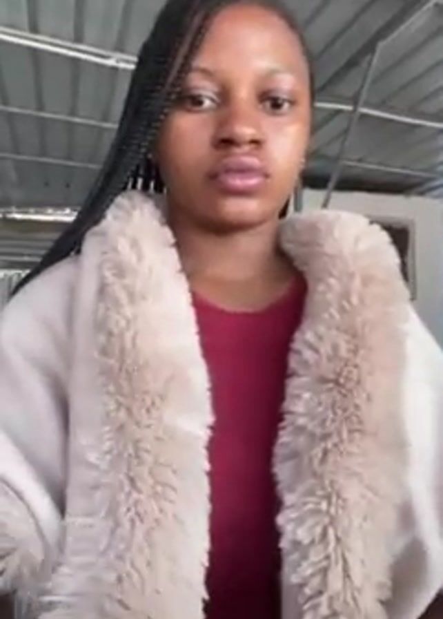 A person with braids, a red shirt, and a tan fluffy jacket is shown in the video. The person touches their stomach area. The surroundings are unclear.