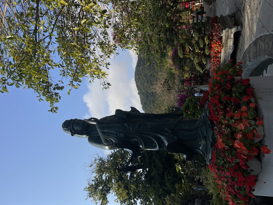 The image displays an outdoor garden area in Sơn Trà Ward, Vietnam, under a clear blue sky with scattered white clouds. A prominent, dark-colored statue of a standing figure, possibly a Bodhisattva or deity, occupies the left foreground. The statue is adorned with flowing robes and a headdress, with its right hand raised in a gesture, palm facing forward. Its base is surrounded by a dense, circular arrangement of potted red and orange flowers, forming a raised bed that also features a small visible water basin. To the right of the statue, a stone-paved pathway curves through a landscaped garden. This area contains a variety of lush green trees, including a large deciduous tree partially framing the upper right of the scene, and numerous decorative planters. These planters hold vibrant flowering plants in shades of pink, purple, red, and orange, alongside meticulously sculpted bonsai trees. In the middle ground, several indistinct human figures are visible; one individual in light-colored clothing stands near a large planter, facing away from the camera. A large, heavily forested mountain dominates the background, rising under the clear sky.