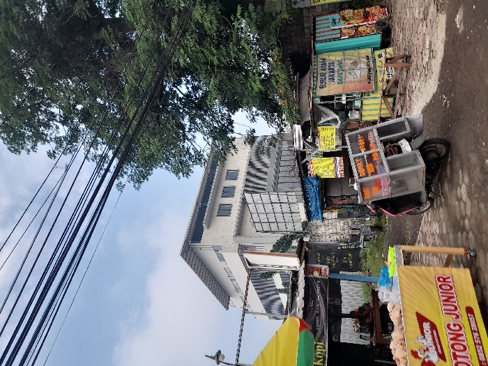 A street scene features several mobile food vendors and carts. A tall building with a modern architectural style stands nearby, partially obscured by tree branches and power lines. Signage on the carts is visible, indicating various food offerings like "Burug Ayam Jakarta." The carts are positioned on the side of the road, suggesting a bustling street food market.