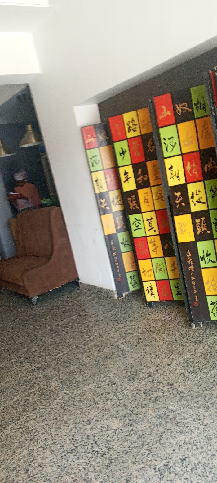 The scene is an interior view within a building located in Fagge A, Nigeria. The foreground features a grey, speckled floor surface. To the right, three rectangular decorative panels stand vertically against a dark grey wall. Each panel displays a grid pattern of black, red, yellow, and green squares, with gold-colored characters inscribed within each square. A white architectural pillar or wall section partially obscures a recessed area on the left. Within this recessed area, a brown upholstered armchair is positioned. An individual, wearing a light-colored head covering and a reddish-brown long-sleeved garment, is seated in the armchair, actively reading a book or document. Two brass-colored, bell-shaped pendant light fixtures are suspended from the ceiling in this background section.