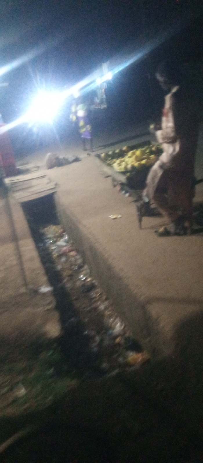 The image depicts a nighttime street scene in Akwanga, Nigeria, characterized by low light and artificial illumination. A prominent open concrete drainage ditch, filled with various refuse items including plastic and debris, extends from the lower left towards the mid-ground. Wooden planks partially cover the ditch in the foreground left. Adjacent to the ditch is a flat, light-colored concrete surface, likely a sidewalk or market area. In the mid-ground, a vendor's stall or table is set up, displaying a large quantity of light-yellow, spherical fruits, possibly citrus. An individual wearing a patterned purple and yellow garment stands further back behind the stall, partially illuminated by a bright, localized light source positioned on the far left of the frame, which causes significant lens flare. Another individual, partially visible in the right foreground, appears to be standing or seated near the fruit display, wearing light-colored, possibly flowing attire. The background is largely dark and indistinct, suggesting unlit structures or open areas. No specific interactions are clearly discernible, but the setup implies commercial activity.