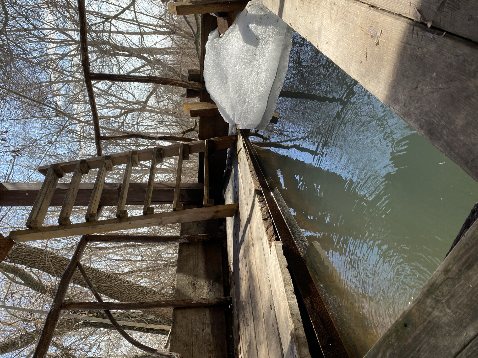 The image depicts a wooden structure, possibly a platform or bridge, adjacent to a body of water. A large chunk of ice is clinging to the edge of the structure, partially submerged in the water. The water reflects the sky. In the background, bare tree branches are visible against a bright sky. The construction appears rustic, possibly hand-built, with a wooden ladder leading up to the platform. No people are visible. Based on the prompt, the location is Ulyanovsk, Russia.