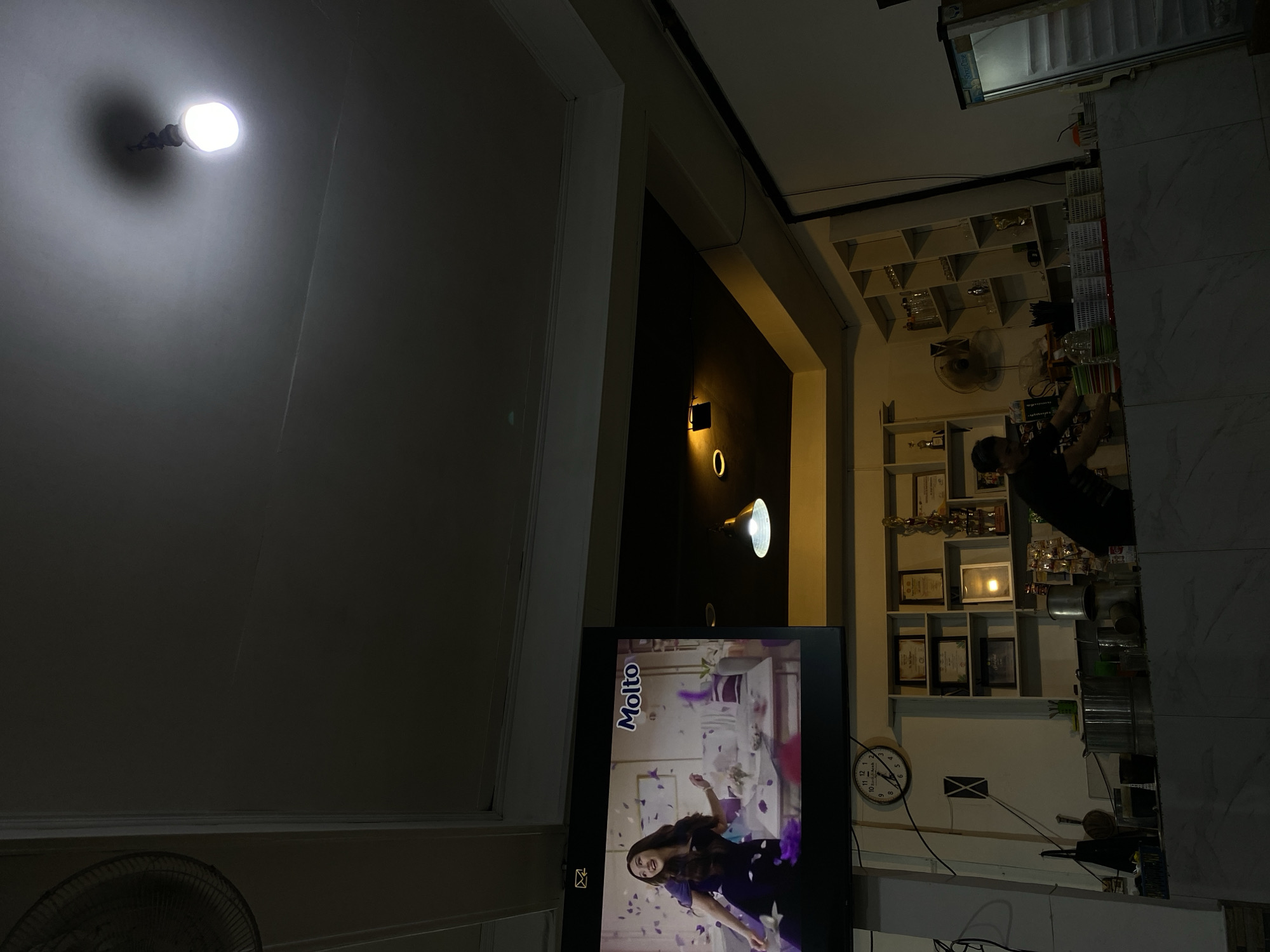 The image presents the dimly lit interior of a commercial establishment in Lhokseumawe, Indonesia. A large flat-screen television, positioned on the left, displays an advertisement for "Molto," featuring a smiling woman in a purple dress amidst purple confetti. Below the television, a circular analog clock reads approximately 12:47. A counter with a white marble-like pattern spans the mid-ground. Behind this counter, a male individual wearing a dark shirt leans forward, attending to various items. The background comprises white open shelving units stocked with framed certificates, trophies, bottles, and kitchen implements including a large metal pot. Two electric fans are visible on these shelves. Overhead, the ceiling features both a prominent, brightly lit exposed bulb and several dimmer, warmer recessed light fixtures. To the far right, a tall, narrow display refrigerator with empty interior shelves is present.