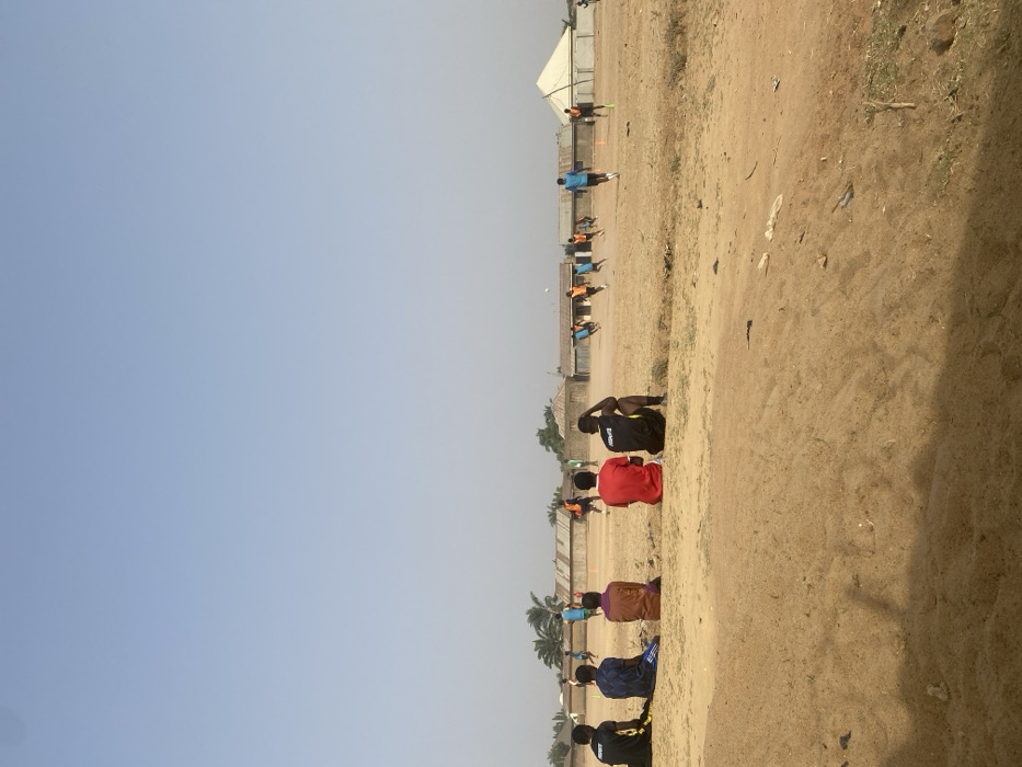 The image displays an outdoor, unpaved dirt and sand field in Sabon Tasha, Nigeria, under a clear, light blue sky