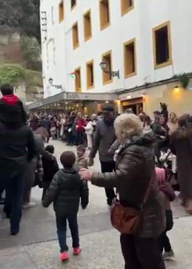 bustling public square in what appears to be a European town or city. The square is paved with light gray stone, and lined with buildings of varying architectural styles. The main building in view is white with symmetrical rows of windows framed in a yellow-gold color. A restaurant or business storefront with an awning and signage is located at the base of this building. A crowd of people, of all ages, is gathered in the square. Many are wearing warm winter clothing, including jackets and hats. Several children are moving about, some running and some being held by adults. A stroller is visible in the crowd. Some adults are looking towards something or someone, seemingly waiting for something to happen. A hillside with trees and buildings is visible in the background to the left. The sky is overcast and the lighting is soft, suggesting it is either early morning or late afternoon. The camera moves slightly, panning to keep the crowd and activity in view.