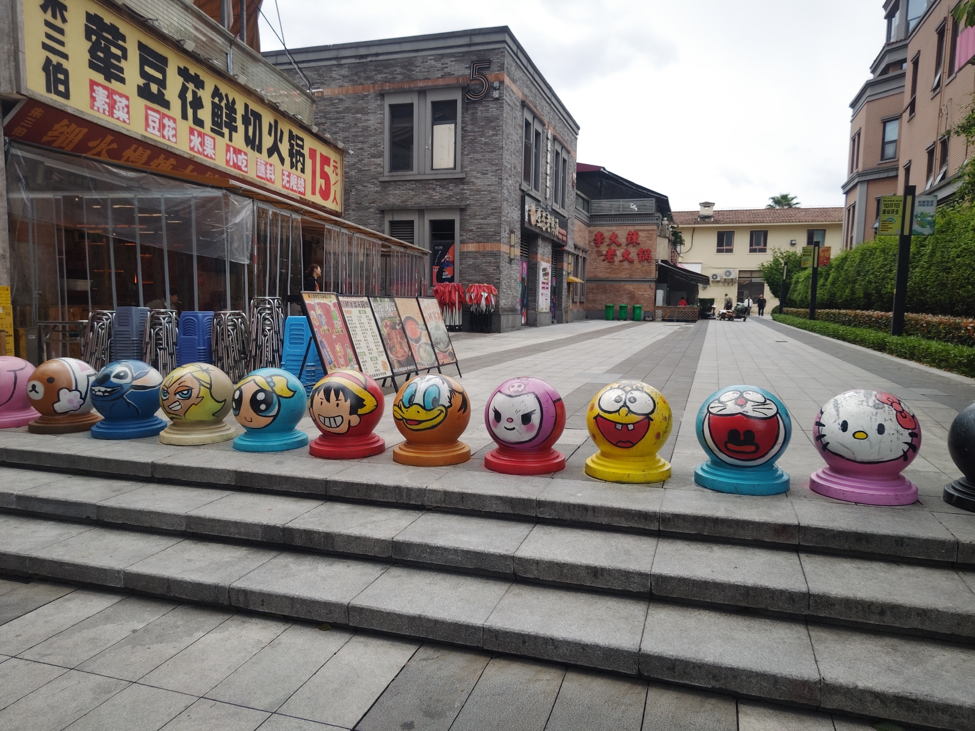 Here is a detailed description of the image: **General Description:** The image depicts a street scene in a commercial area, likely a pedestrian zone, with a row of cartoon-painted bollards lining the steps leading towards shops and restaurants. **Foreground:** A row of roughly 10 bollards is painted with various cartoon characters, including recognizable figures like Hello Kitty, Doraemon, SpongeBob, and others. The bollards are set on individual colored bases, adding to their visual appeal. The bollards sit on a set of gray, stone steps made of individual rectangular pavers. **Midground:** The background shows a variety of storefronts and buildings. A restaurant with a yellow sign, adorned with Chinese characters, can be seen on the left side. The sign advertises "Hot Pot" for 15 yuan. The restaurant has a visible interior with tables and chairs. Next to it is a brick building with a large number "5" on the upper part of the building. Further back, other buildings are visible. **Background:** The background features a paved street leading away from the viewer. People are seen in the distance, suggesting activity in the area. There is another restaurant on the right. **Environment:** The scene appears to be a commercial street in a city, with shops and restaurants lining the walkway. The sky is overcast, casting a soft light over the scene. **Details:** * The Chinese characters on the yellow restaurant sign translate to "Hua Douhua Fresh Cut Hot Pot". **Possible Location:** The image is likely taken in Chongqing High-tech Zone, China, based on the Chinese characters and architectural style.