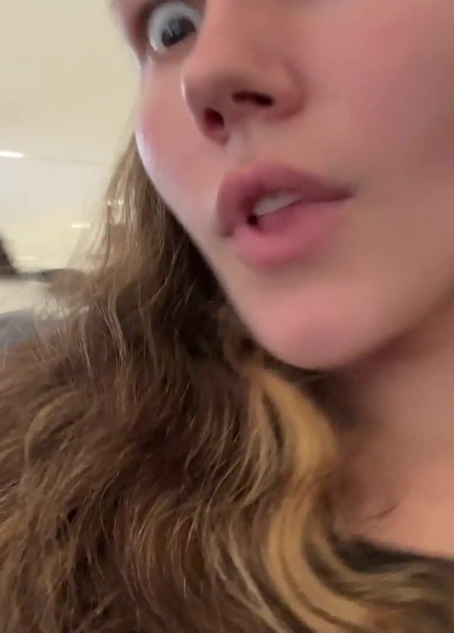 Two young women are sitting on a gray bench in what appears to be an airport. The woman in the foreground wears a brown jacket over a black top and has light brown hair with darker roots. The woman behind her has longer auburn hair. The woman in the foreground is recording the video. She initially looks somewhat concerned but then says "Shhh!" and appears startled. The camera then moves toward the auburn-haired woman, who smiles at the camera. The background shows the bright, open space of an airport terminal with white pillars and tiled floors. People are seen walking in the distance.