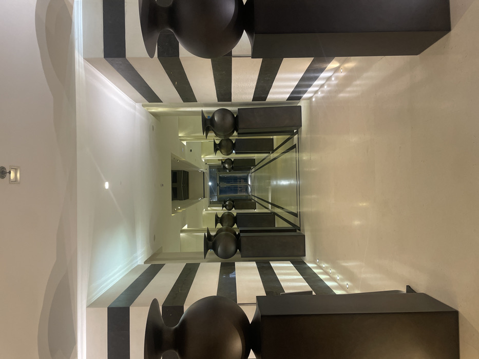 This image depicts a long, symmetrically designed interior hallway within the InterContinental Marseille - Hotel Dieu, located in Marseille, France. The corridor features a light-colored, reflective floor with a dark border running down its center. Both side walls and prominent columns are adorned with a distinctive pattern of wide, horizontal black and off-white stripes. Along both sides of the hallway, a series of identical dark, large, spherical urns with wide mouths are displayed on tall, rectangular, dark pedestals, receding into the distance. There are at least four visible urns on each side. The walls directly beneath the striped sections feature small, recessed upward-facing lights illuminating the lower portion of the striped pattern. The ceiling is white with multiple recessed light fixtures providing ambient illumination. At the far end of the hallway, a set of double doors, possibly glass, is visible, reflecting some light from an area beyond. No individuals are present in the scene.