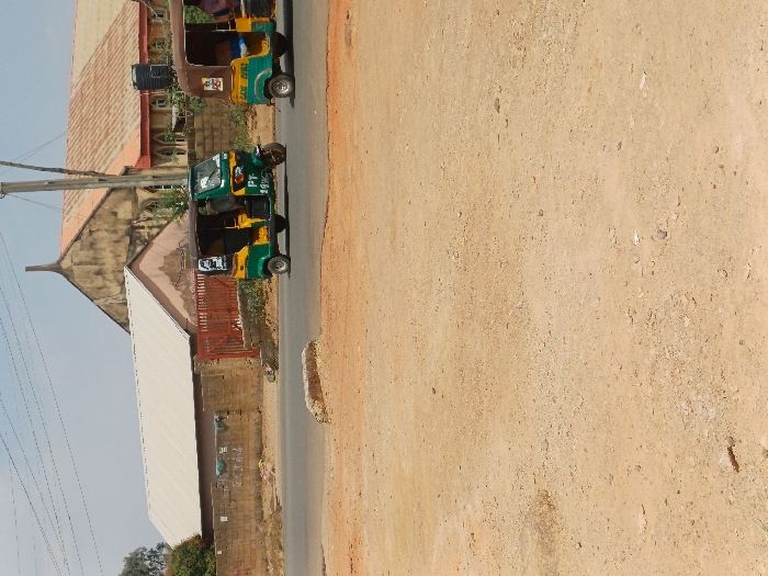 The image displays an outdoor scene in the city of Unknown, Unknown, under a clear, bright sky. The foreground consists of a wide, unpaved area of dry, light-brown earthen ground with scattered small debris. A paved asphalt road crosses the mid-ground, containing a small, irregular concrete or rock mound. Two three-wheeled auto-rickshaws are in motion on this road, traveling from left to right. The lead vehicle is green and yellow, displaying "PT 189..." on its windshield; a driver is partially visible. A second, brown and yellow auto-rickshaw follows, showing "SCM MAY" on its side; a passenger is discernible within. Beyond the road, a low masonry wall runs horizontally, behind which is a long, single-story building with a light-colored corrugated metal roof on the left. Further back and to the right stands an older building with weathered light-brown walls, a reddish-brown corrugated metal roof, and a prominent peaked facade featuring multiple pointed arch windows. A dark utility pole stands on the right side of the road, and overhead utility lines are visible against the blue sky. Sparse green foliage is present on the far left, behind the masonry wall.