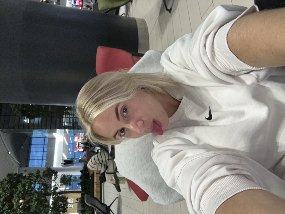 The image displays a young blonde female taking a selfie inside a modern airport terminal, specifically Istanbul Airport (IST) in Arnavutköy, Turkey. The subject, visible from the chest up, is wearing a light-colored, possibly off-white, crew-neck sweatshirt featuring a black Nike swoosh logo on the front. She is captured in a playful pose, extending her pink tongue. Behind her head, a red upholstered chair is partially visible, and she appears to be leaning against a light grey cushion. The background reveals the expansive, well-lit interior of the airport. Key architectural elements include a high, curved ceiling with integrated lighting, large glass walls extending across the scene, and a prominent, dark-colored cylindrical structural column to the right. Several indoor trees with green foliage are strategically placed within the terminal, enclosed by modern planters. Public seating areas are visible, featuring contemporary lounge chairs in black, grey, and green. In the mid-ground, another individual wearing a striped shirt is seated in a lounge chair, looking downwards. Distant retail outlets with illuminated signs are discernible through the glass panels. The scene is bright, with both natural light entering through the large windows and comprehensive artificial illumination within the terminal.