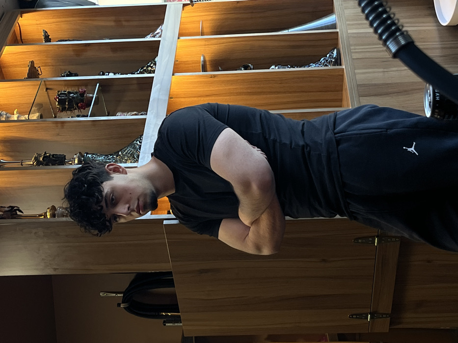A young adult male stands with arms crossed over his chest within an indoor establishment, likely a shisha lounge or cafe in Sofia, Bulgaria