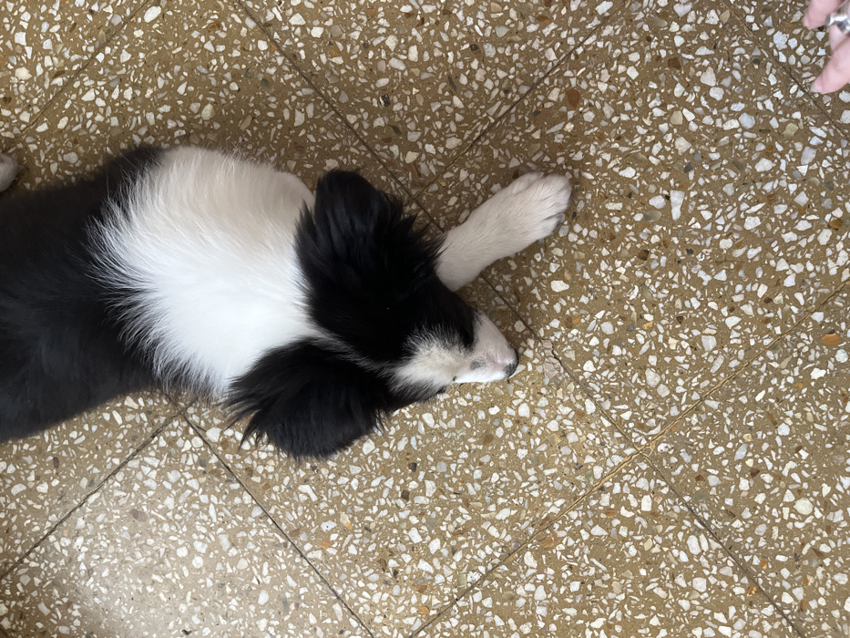 A black and white Border Collie puppy sleeps on a tile floor. The puppy is lying with its head facing the upper right corner of the frame. The puppy's front right paw is extended. The floor is light brown with a pattern of small white and gray stones. A hand with rings is visible in the upper right corner.