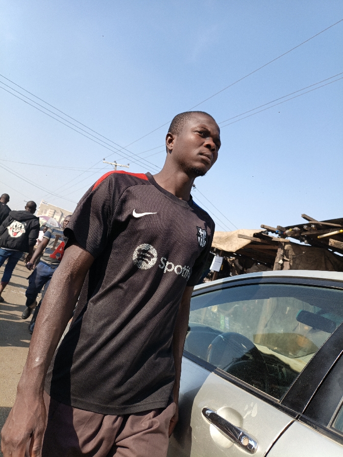 An outdoor street scene is captured in Kofar Mazugal, Nigeria, under a clear, bright blue sky. The primary subject is a young adult male, positioned slightly to the right of the frame's center, facing partially left with a serious expression. He wears a black short-sleeved Nike t-shirt featuring a red stripe on the right shoulder, a white Nike swoosh, a white Spotify logo, and a dark crest. His visible right arm shows prominent veins, and he wears dark brown trousers. To his immediate right, a silver sedan, partially covered in dust, displays its driver's side front window and door handle. In the mid-ground to the left, several individuals are present, including one person seen from behind wearing a black hoodie with a white cartoon face design. Further right, behind the car, are weathered makeshift structures constructed from wood and possibly canvas or tarpaulin. Overhead utility lines span the sky, and a utility pole is visible in the distant background. The ground is an unpaved surface.