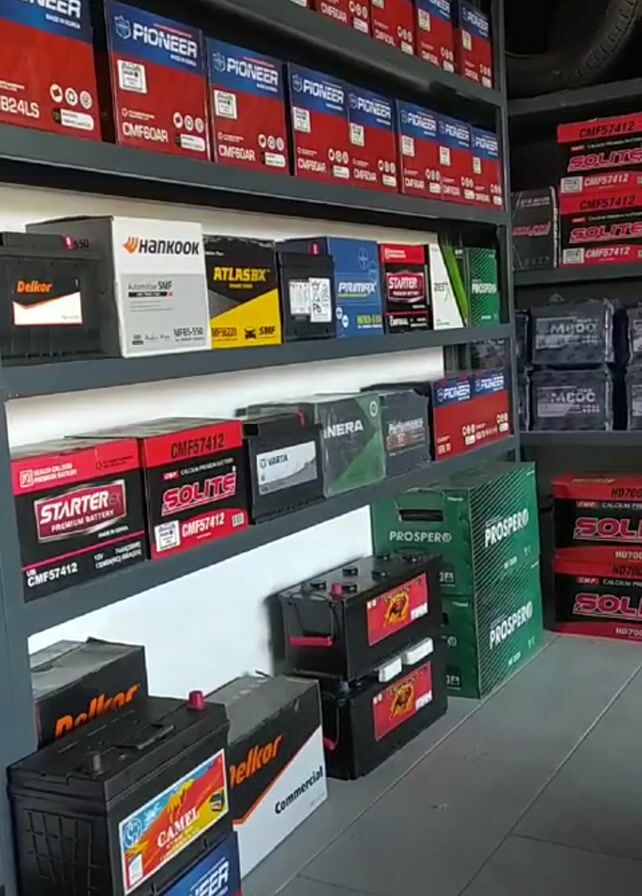 The camera pans across shelves filled with car batteries of various brands including Pioneer, Delkor, Hankook, AtlasBX, Starter, Solite, Varta, and Prospero