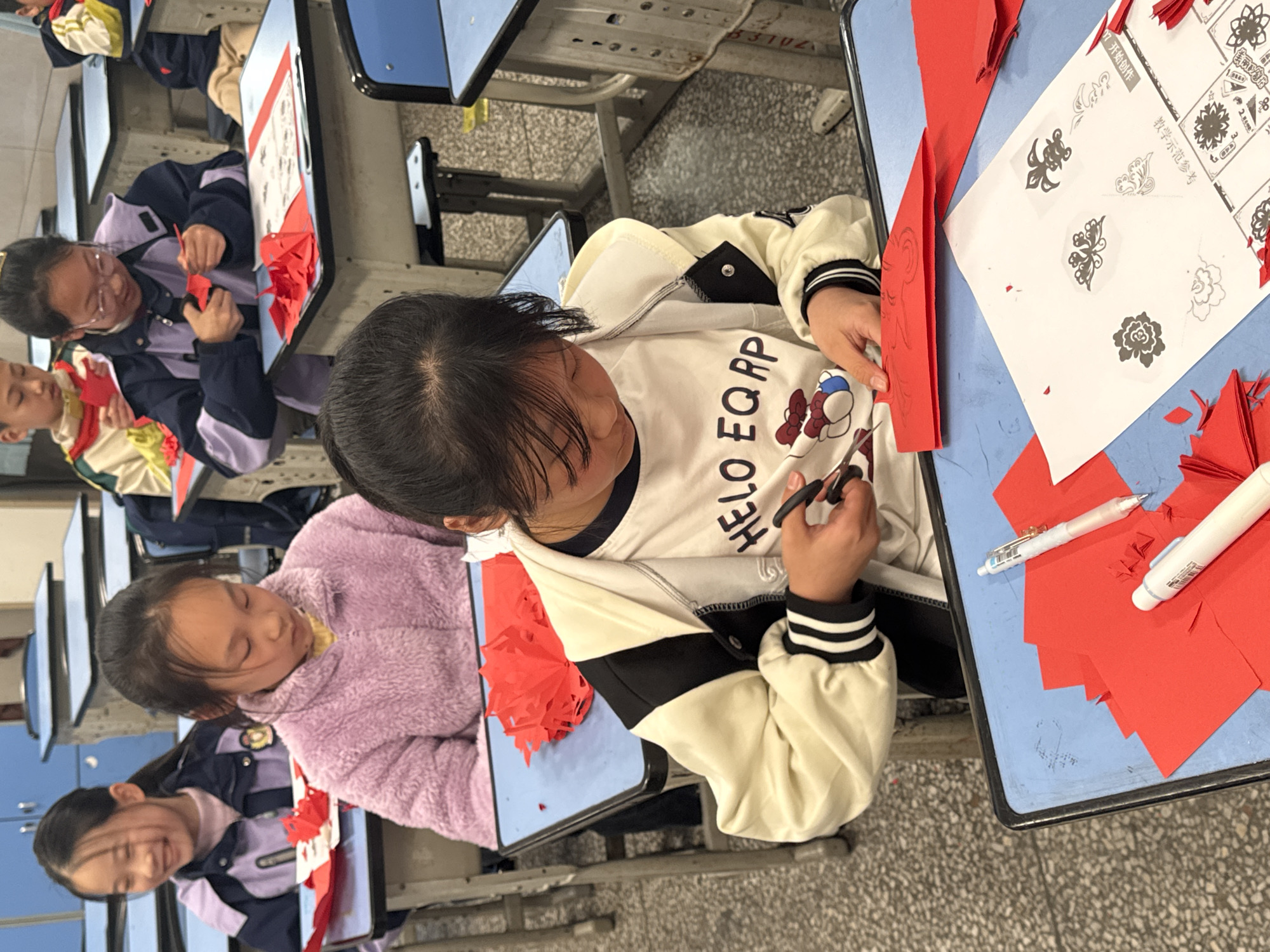 In a classroom in Longta, China, multiple young students are engaged in a paper-cutting activity. The primary subject is a female student, seated at a blue-topped desk in the foreground, meticulously cutting a piece of folded red paper with black-handled scissors. She wears a cream and black varsity-style jacket over a white long-sleeved shirt emblazoned with "HELO EQRP" and a graphic. On her desk, alongside numerous pieces of red paper (some folded, some cut), is a white sheet displaying various black and white paper-cutting design templates. Two white pens also rest on the desk. Behind her, another female student with dark hair, wearing a light purple fluffy jacket, is seated at an adjacent desk, looking down at her own red paper creations. To her left, a third female student in a navy and light purple uniform jacket smiles towards the left, with red paper visible on her desk. Further back and to the right, another student, wearing glasses and a similar uniform, is actively cutting red paper. The classroom environment features blue-topped desks with light grey metal frames, and the floor is composed of grey terrazzo tiles. The students appear focused on their individual crafting tasks.