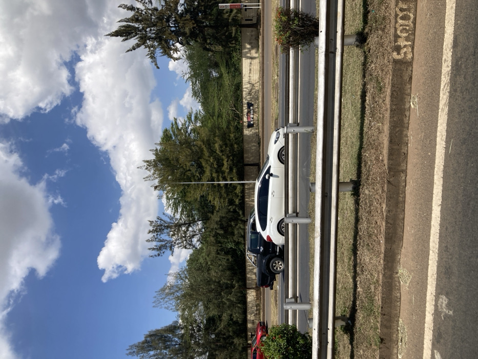 This image depicts a daytime roadside scene in Theta ward, Kenya, under a blue sky with scattered white cumulus clouds