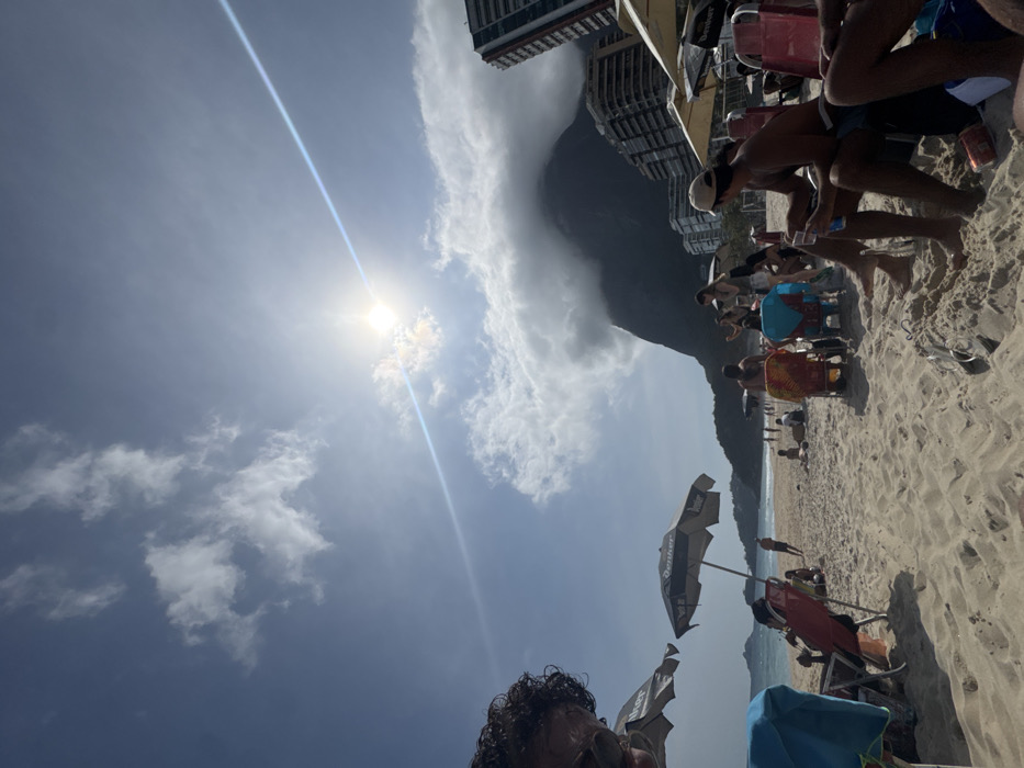 A beach scene under a bright, sunny sky. Numerous people are sitting and relaxing on the sand, some under umbrellas. A building is visible in the background, alongside a mountain shrouded in cloud cover. The beach stretches out in the distance, with more people scattered along the shoreline. The sun's glare is prominent in the sky, creating a lens flare effect.