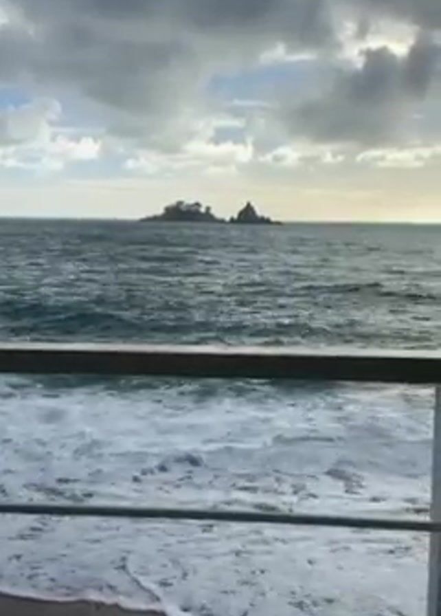 view of the sea from what appears to be a balcony or terrace. In the distance, there are two small islands. The sea is choppy with visible waves. The sky is overcast with dark, heavy clouds. In the foreground, a railing can be seen, partially obscuring the view of the beach where the waves are breaking. A person's voice can be heard in the background.