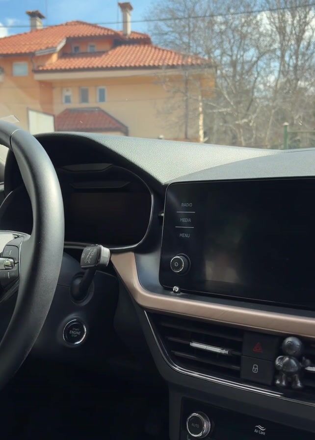 interior of a car. The dashboard is visible with a steering wheel on the left and a digital display in the center. Below the screen, there's a horizontal vent with a small black figurine and a cat-shaped air freshener hanging from a suction cup above the vent. The air freshener features a meme-like image of a cat with its mouth open. Outside the car, through the windshield, there is a large orange house with a red tile roof and a tree. The sky is blue with some clouds.