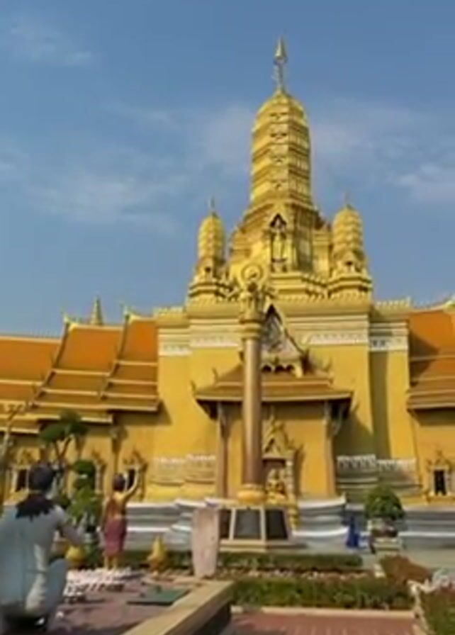 n exterior view of a golden building with a tall central tower, under a blue sky with some clouds. The building has multiple levels and a distinctive roofline with gold embellishments. In front of the building, there are statues of people, a large vertical pillar, and manicured garden areas. The foreground includes a brick pathway. The camera zooms in slightly on the golden tower.