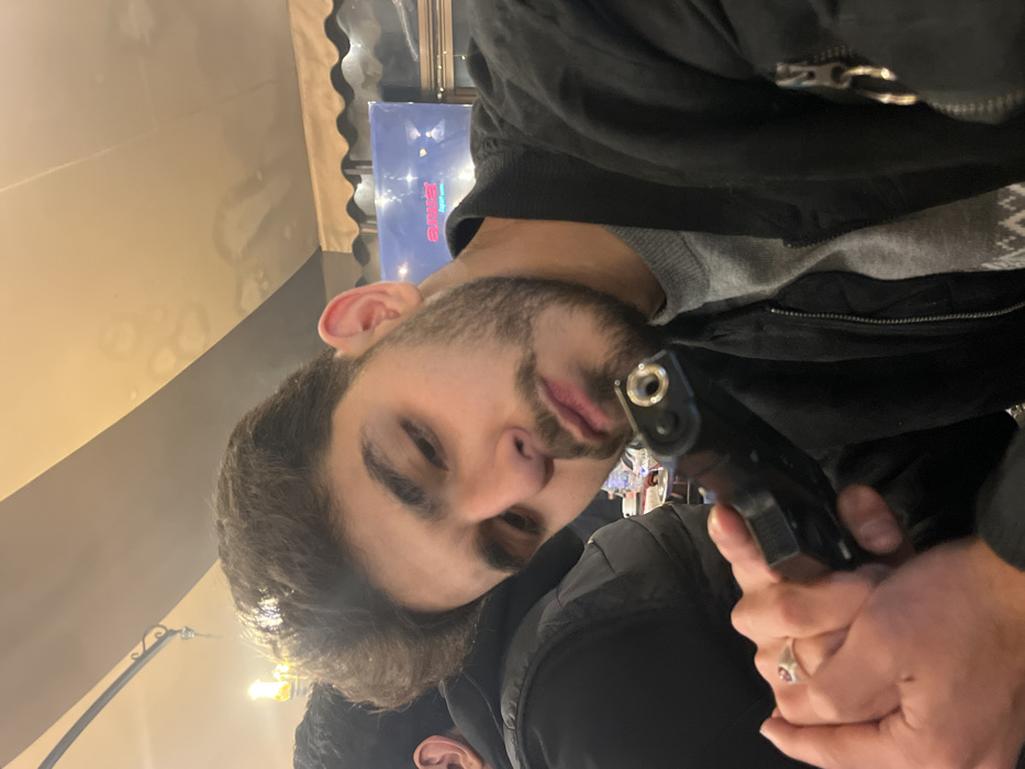 A bearded person, wearing a black jacket and gray sweater, points a black handgun towards the camera. The person's right hand is visible on the gun. A ring can be seen on the index finger of their right hand. Another person's ear is visible in the bottom left corner. The background consists of a blurred interior setting with lighting and a blue sign.