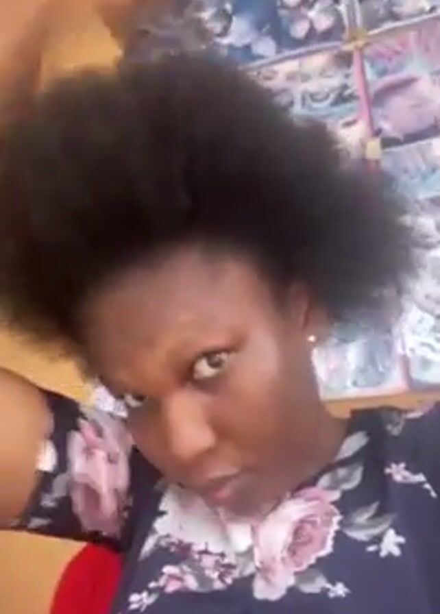 A woman with dark skin and dark, fluffy hair is sitting indoors in front of a wall covered with pictures. She is wearing a navy blue floral top with pink and white flowers. She is looking directly at the camera with a neutral expression. The woman is using her hand to style her hair, moving it away from her face. She is seated in what appears to be a red chair, only a small part of which is visible. The room has natural light.