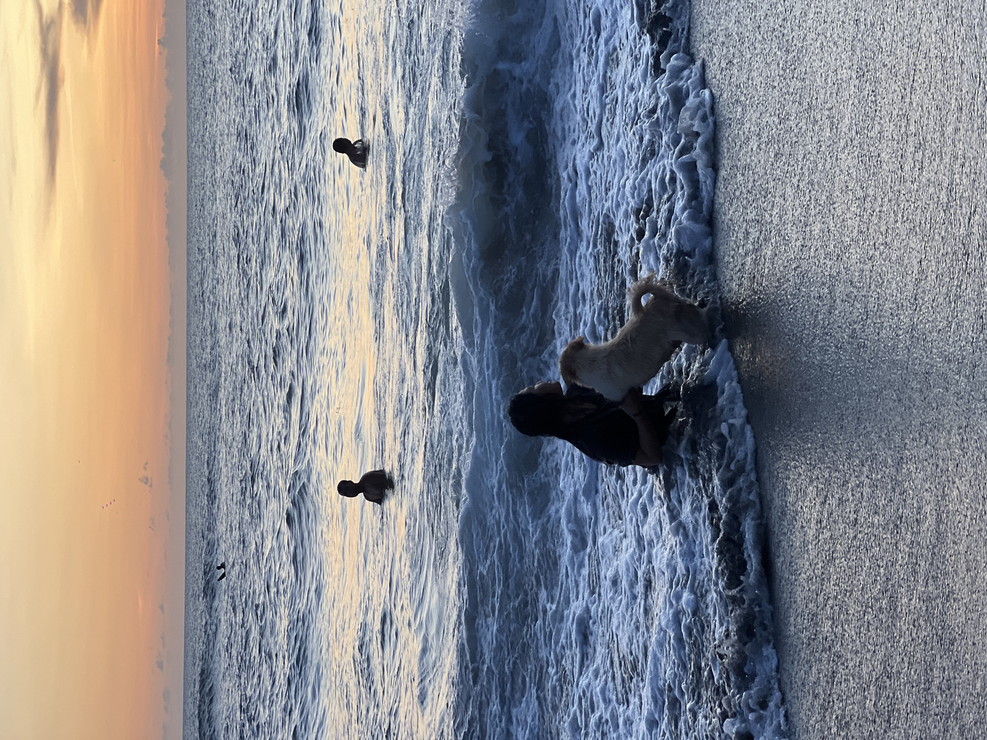 beach scene in Canggu, Indonesia, at dusk or dawn. The sky displays a gradient of colors from orange to blue. Two individuals are wading in the ocean, visible as silhouettes. A third person stands closer to the shore, accompanied by two dogs that appear to be interacting with the water or the person. The ocean's surface is visible, with waves crashing near the shoreline, creating a foam effect. The beach sand is visible on the right side.