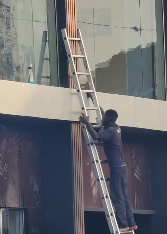 A man is climbing an aluminum ladder that is leaning against a modern building. The man is wearing dark clothing and brown shoes. The building has large glass windows with a bottle and another ladder reflected in the glass. The building facade also includes dark panels with a textured design and vertical light-colored wooden slats. The base of the ladder is on a concrete ledge.