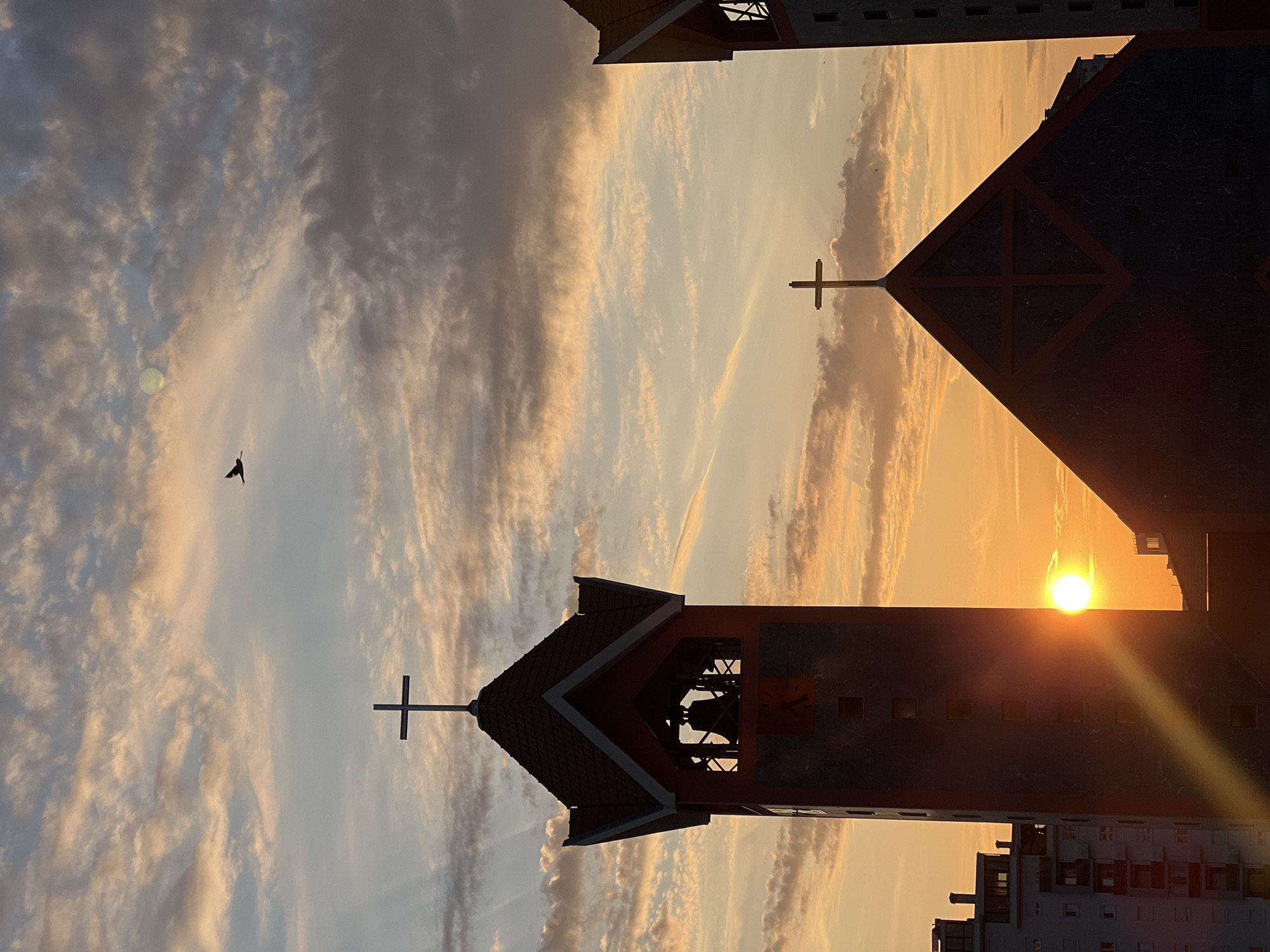 sunset view in Bar, Montenegro, featuring a church and adjacent buildings