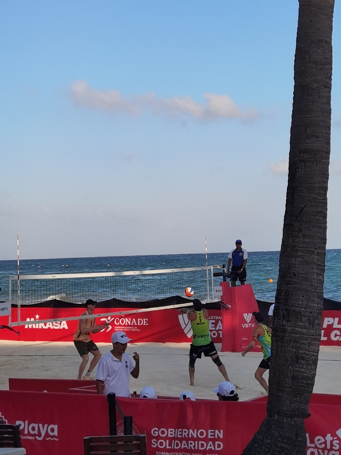 beach volleyball game taking place on a beach in Playa del Carmen, Mexico, specifically at the coordinates 20