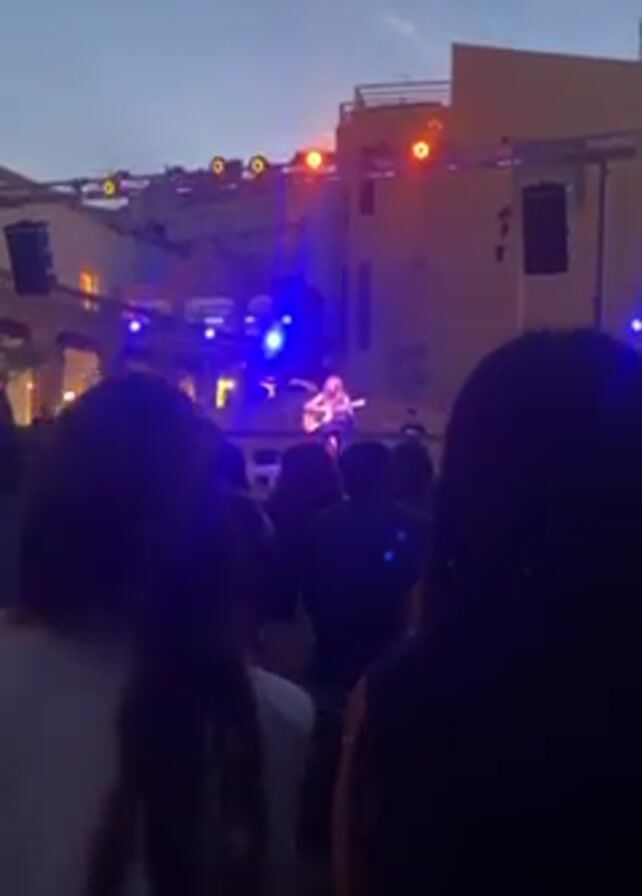 female singer performing on a stage with an acoustic guitar. She is illuminated by blue and orange stage lights, and there is a small band behind her. The audience is seated, with their backs visible to the camera. The performance is taking place outdoors, with buildings visible in the background. The sky is a dusky blue.