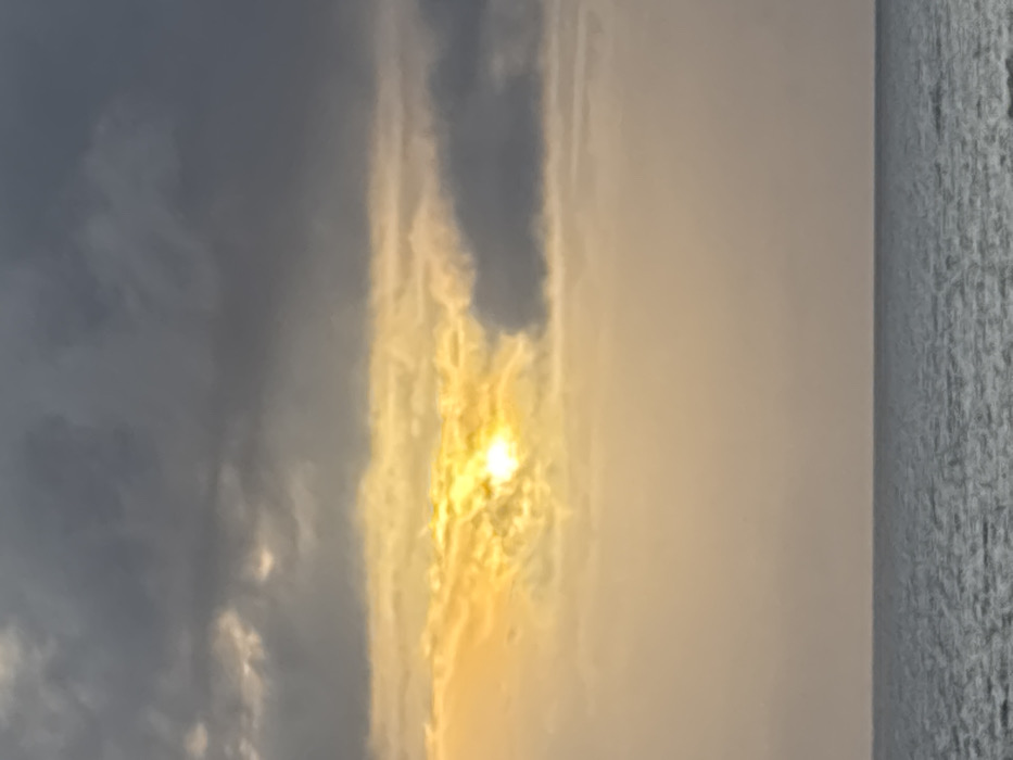 The image depicts a cloudy sky with a gap in the clouds revealing the sun. The sun is partially obscured by thin clouds, creating a diffused golden light. The clouds vary in color from dark gray to light gray and white. An undiscernible gray object appears along the right side. The scene suggests either sunrise or sunset.