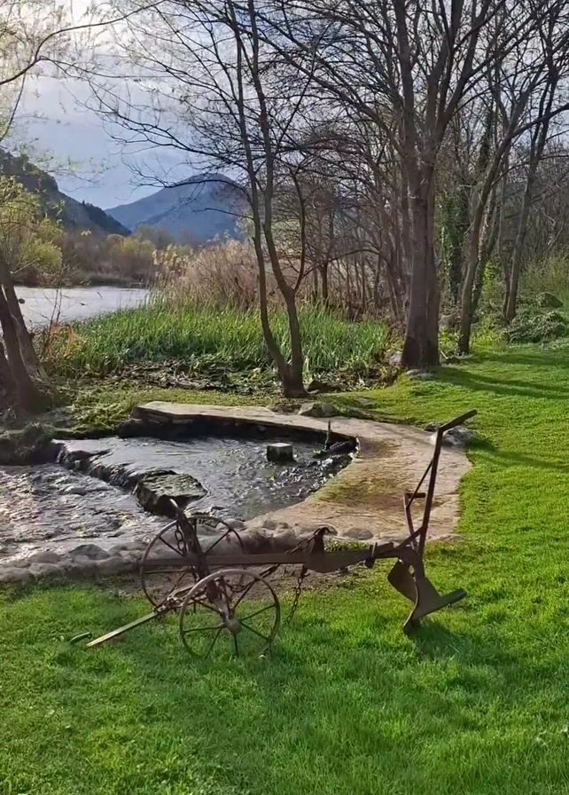 The video showcases a tranquil outdoor scene. The foreground is dominated by a neatly manicured grassy area. An old, rusty farm tool sits on the grass, positioned near a small stream that flows into a pond. The pond is bordered by a paved walkway. Beyond the pond and stream, the view opens up to a wider body of water, likely a river or a lake, surrounded by reeds and other vegetation. In the distance, a mountain range is visible under a partly cloudy sky. Several bare trees frame the scene, adding to the natural and serene atmosphere.