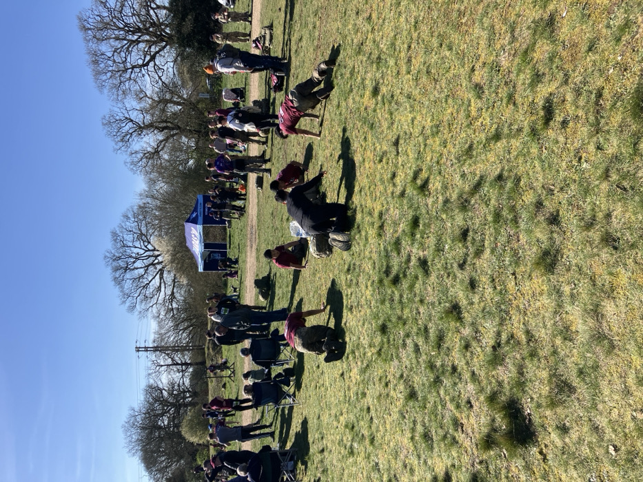 The image captures an outdoor event occurring on a bright, sunny day within an open, patchy green grassy field in Colchester, United Kingdom
