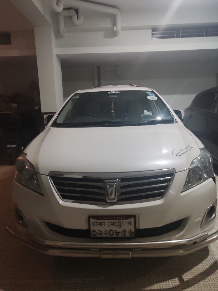 - "The image presents a frontal view of a white Toyota Premio sedan parked in an indoor facility, identified as a parking garage in Dhaka, Bangladesh, by the visible license plate "ঢাকা মেট্রো-গ ৩১-৭০৯৬"" by FM-BG2N53, licensed under CC BY 4.0